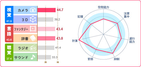 さらに仕事や受験に必須である「空間能力」「注意集中力」「記憶力」といった認知機能も同時に分析。7つの認知機能バランスを表示し、それに沿った最適アドバイスを表示します。
